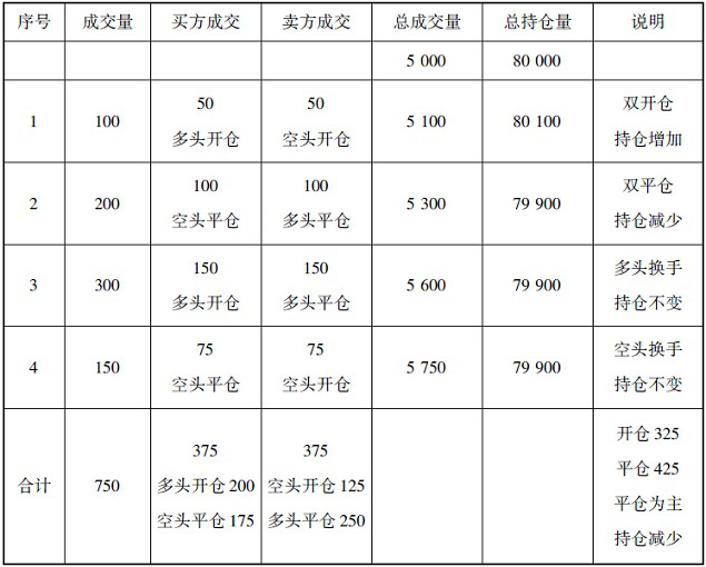 换手交易有多头换手和空头换手,当原来持有多头的交易者卖出平仓,但新的多头又开仓买进时称为多头换手;而空头换手是指原来持有空头的交易者在买进平仓,但新的空头在开仓卖出。下表举例说明按双边计算时多空双方开仓平仓与成交量及对应持仓量的变化关系(假定统计之初的总成交量已经有5000手,同时总持仓量为80000手)。